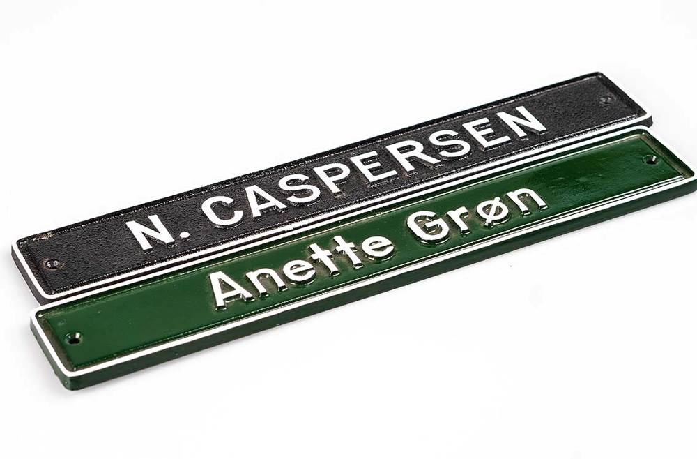 I mange år har et navneskilt på eller ved hoveddøren været et must. Kombineret med et matchende husnummer. Send os en forespørgsel med navn og husnummer, så sender vi en pris.